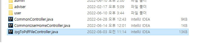 컴파일이 정상적으로 완료되면 JpgToPdfFileController.java이 위치한 폴더에 JpgToPdfFileController.class 파일이 생성된 걸 볼 수 있다.