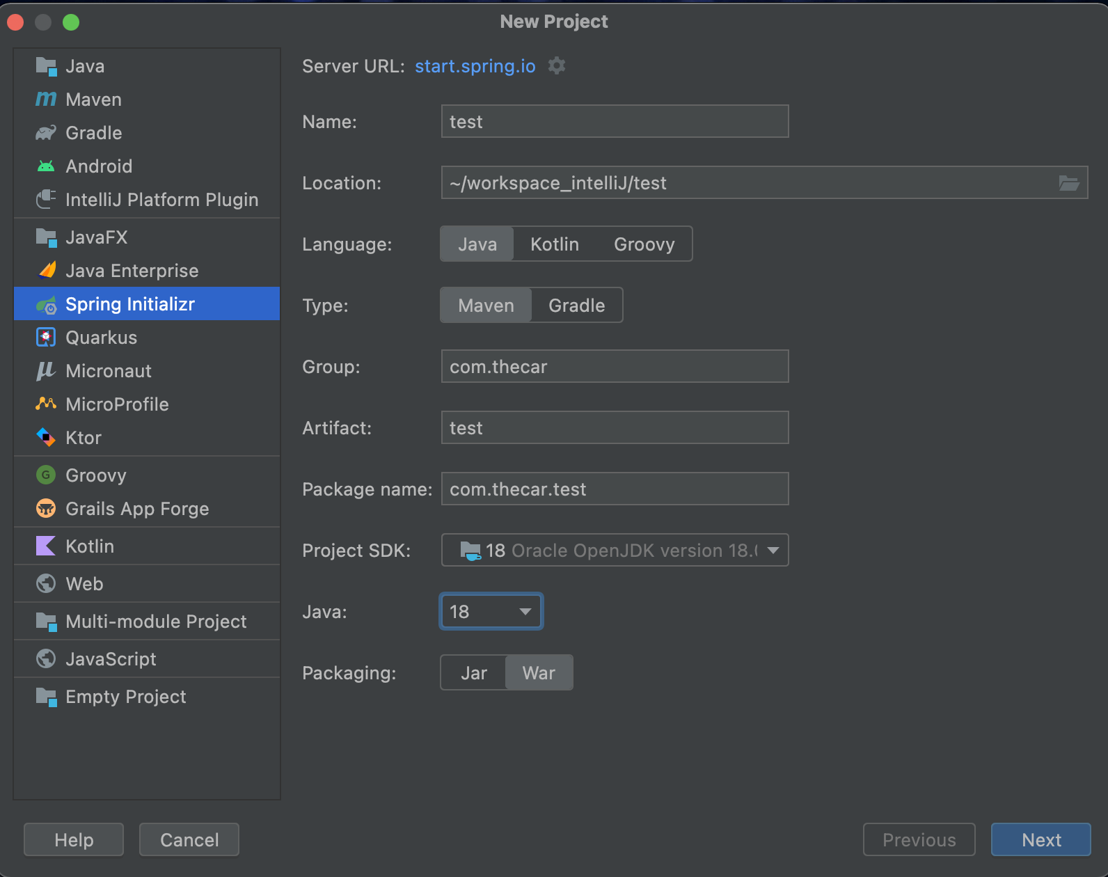 좌측 탭에서 Spring Initializr를 선택하고 본인에게 맞는 설정들을 선택 해주면 된다.