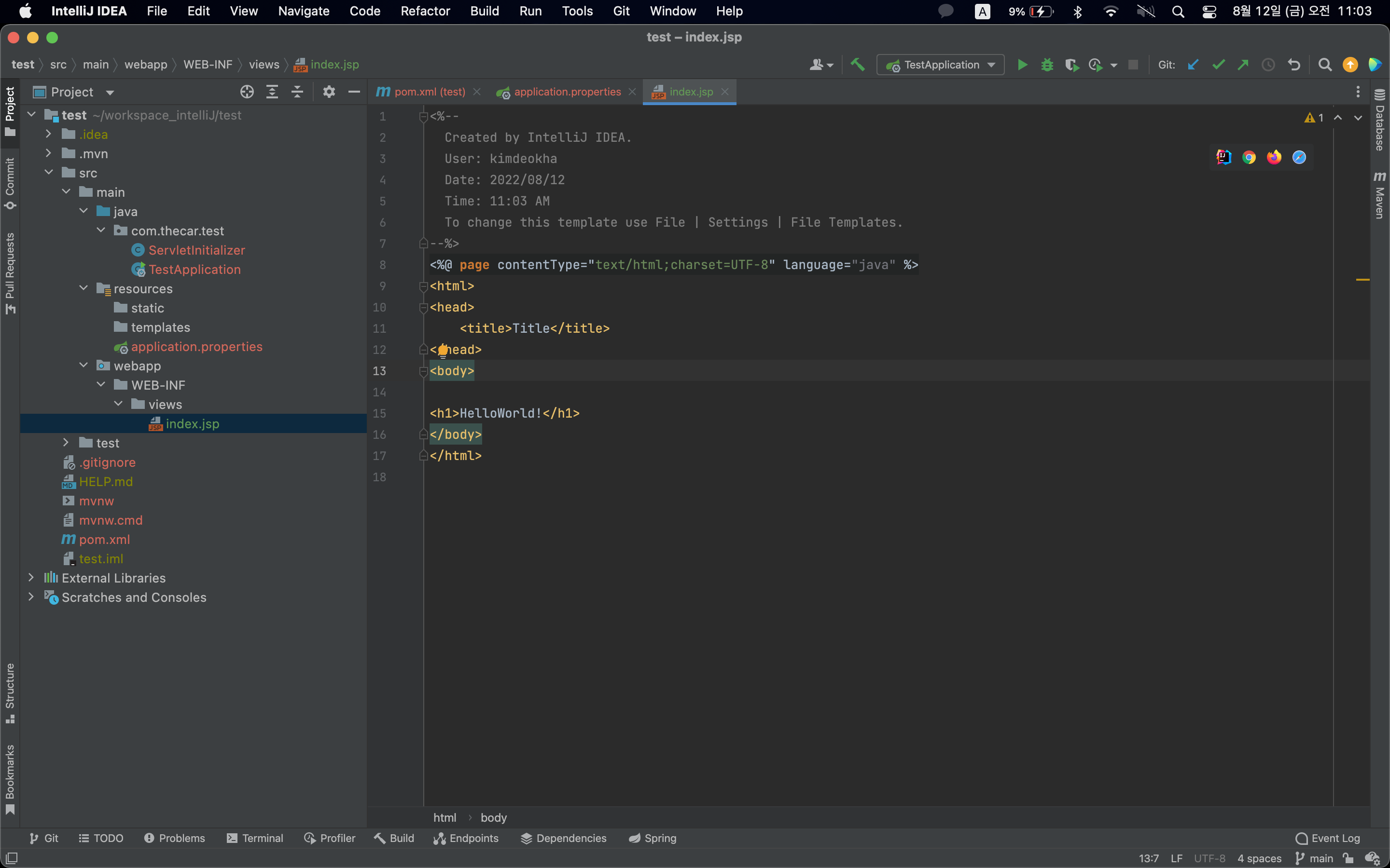 그럼 위와 같은 패키지 구조와 index.jsp 라는 파일이 생겼다.