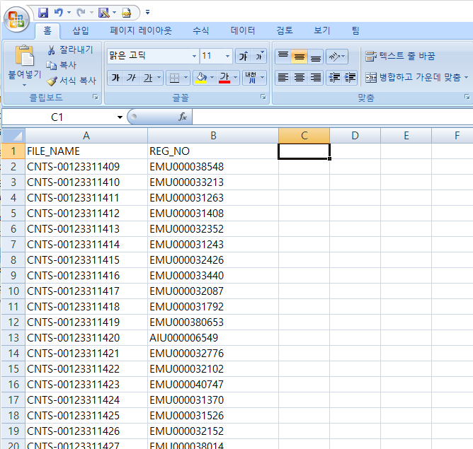 FILE_NAME, REG_NO이 있고 그 밑에 데이터가 존재한다.