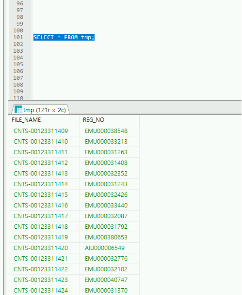 tmp테이블은 FILE_NAME 과 REG_NO 컬럼을 갖고있다.
