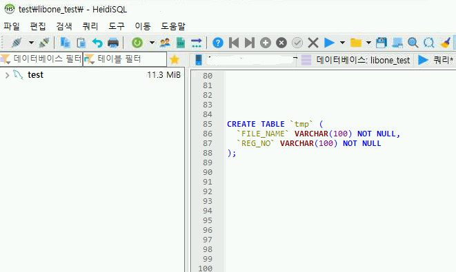 먼저 HeidiSQL에서 tmp라는 테이블을 생성했다.