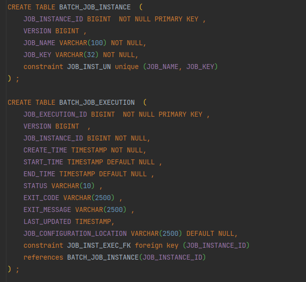 - JOB_KEY : 동일한 job_name의 job_instance를 구분하기 위해 job_parameters를 해시하여 생성한 값